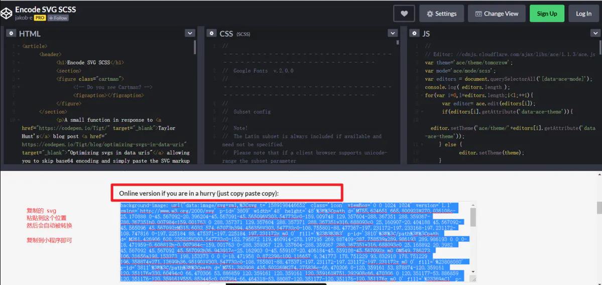 復(fù)制 svg 代碼 注意這里直接使用該url在小程序中是不行的,存在編碼錯誤 下面是一個轉(zhuǎn)編碼的網(wǎng)站